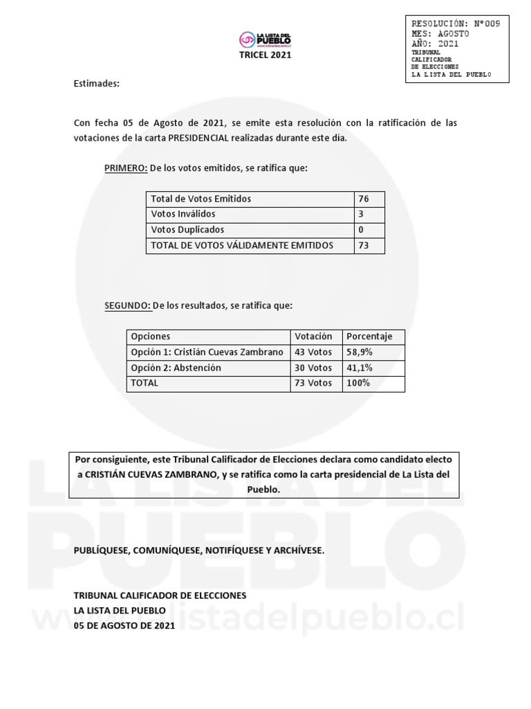 Con un total de 73 votos válidamente emitidos, el candidato escogido fue cristián cuevas zambrano, quien recibió el apoyo de 43 miembros del conglomerado.